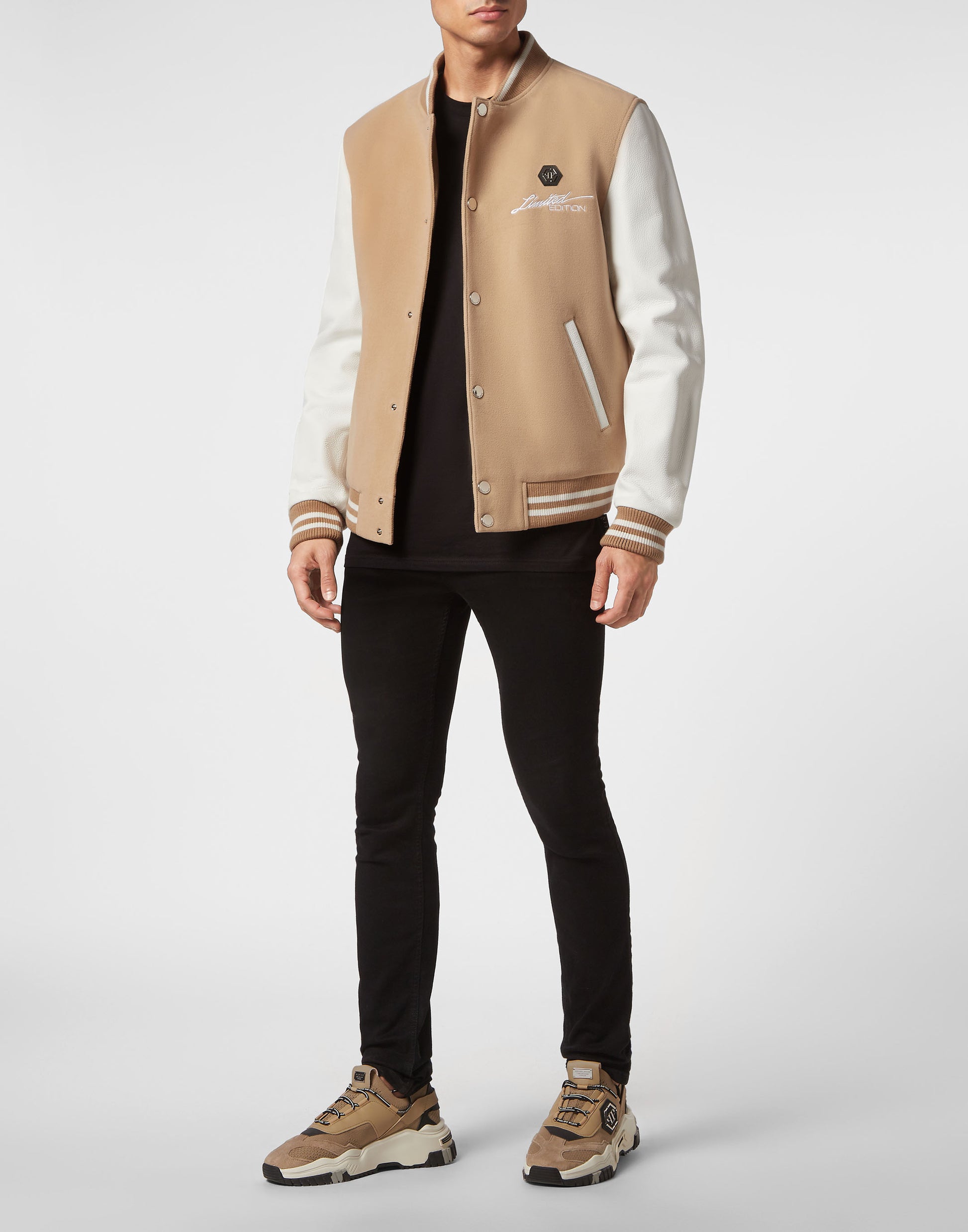 這款 Philipp Plein Wool and Leather Bomber Skull&Bones beige / white 採用高質感的美利諾羊毛主體,搭配白色小牛皮拼接,強調奢華與街頭潮流交織的風格。左胸的經典骷髏與六角徽章點綴,低調卻不失個性。羅紋細節於袖口、下擺與領口處設計,兼顧舒適包覆與立體輪廓,是日常穿搭與造型焦點的理想選擇。