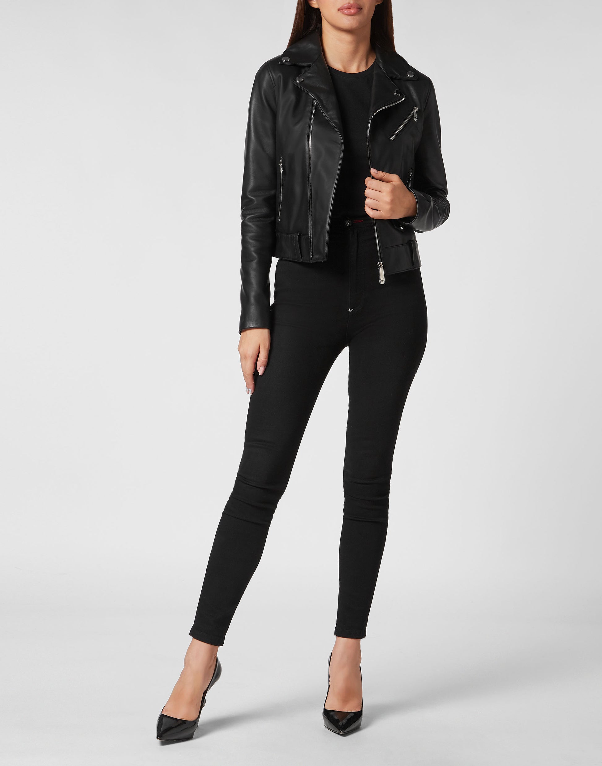 Leather Boxy Biker Jacket with Crystals black