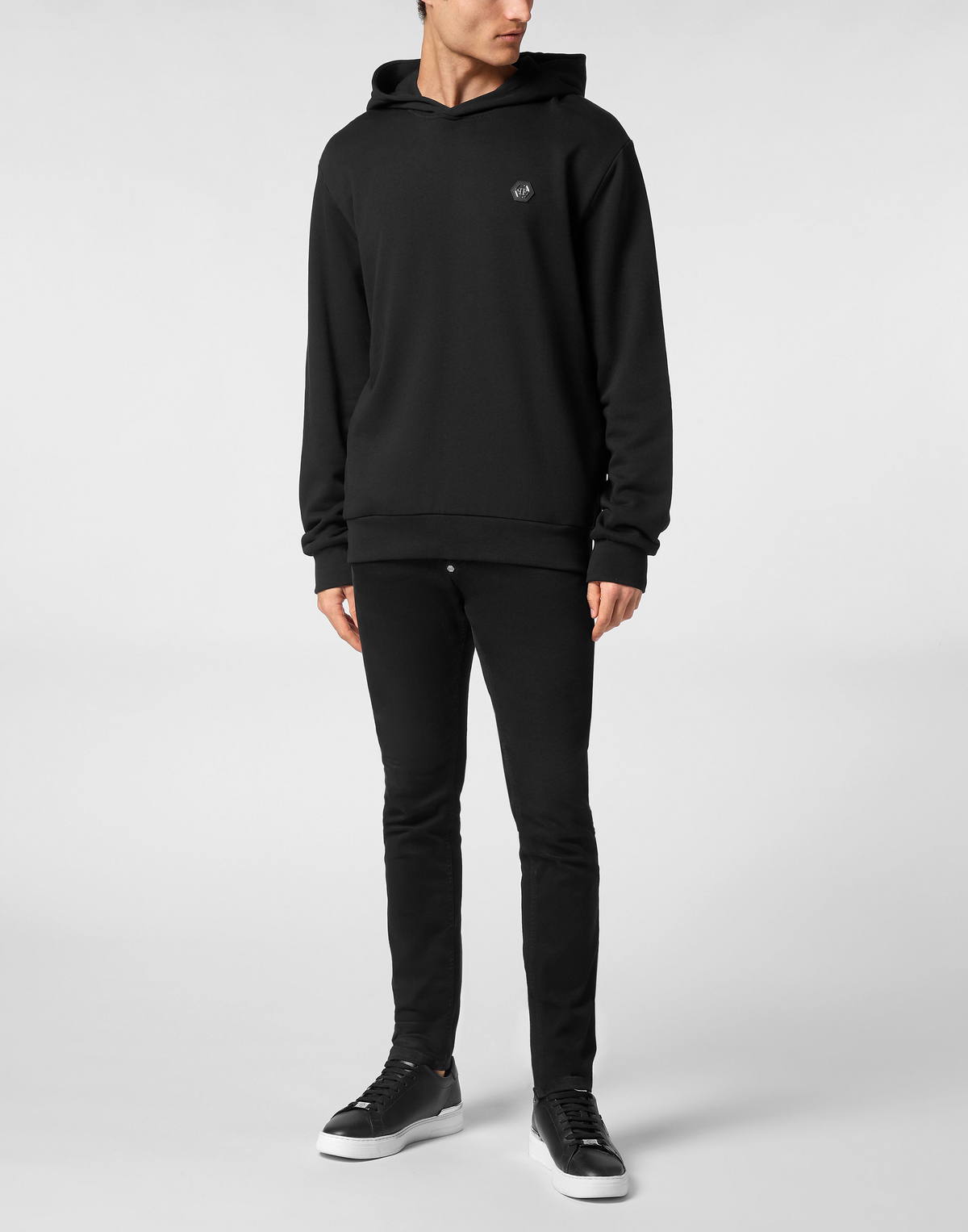 ●正面簡約設計:胸口飾有 Philipp Plein 六角形金屬徽章,低調卻不失辨識度